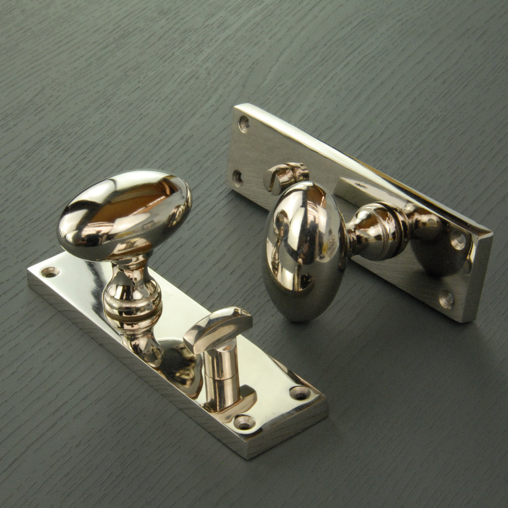 Our Jones & Grey New York Oval Round Door Knobs on a long rectangle backplate